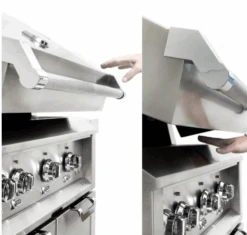 - Flip-down front panel with commercial grade handle for access to gas tank and pullout drawer