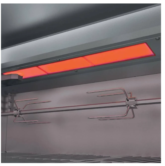 - Patent-pending multi-purpose built-in ceramic infrared rotisserie / searing / finishing burner at 18,000 BTUs with simple touch on function